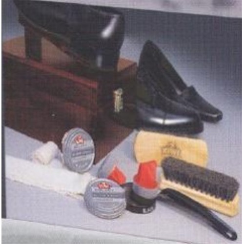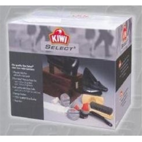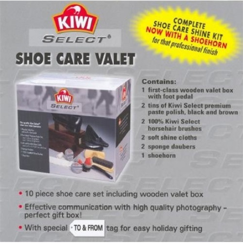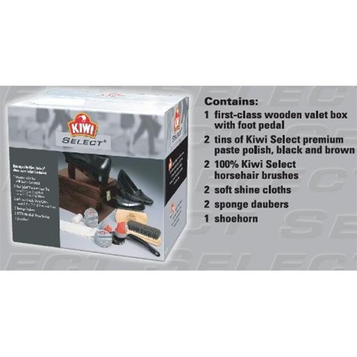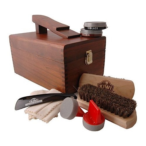 KIWI Shoe Shine Box with Content in elegant wooden box with footrest and filled with 8 Shoe Shine Accessories. All the supplies you need for premium shoe care. The KIWI Shoe Shine Box with Content, Wood consists of an elegant wooden box that offers storage room for all your shoe care accessories and is equipped with a footrest that facilitates effortless shoe care. The KIWI Shoe Shine Box with Content, Wood comes complete with one 1-1/8 oz. tin of KIWI Select Premium Paste in black, one 1-1/8 oz. tin of KIWI Select Premium Paste in brown, 2 Sponge Daubers (one for each color of shoe paste) for easy application of shoe polish, 2 premium KIWI Shoe Shine Brushes with 100% horsehair bristles, a shoe horn, and 2 soft and durable Shine Cloths (each 3.8 x 17.5) for the final touch. The KIWI Shoe Shine Box measures outside 11.5 L x 8 W x 8.5 H. (including footrest). KIWI Shoe Shine Box with Content, Wood (11.5 L x 8 W x 8.5 H, including footrest), Wood with built in footrest Content: 2 KIWI Select Premium Paste Tins (one 1-1/8 oz. black, one 1-1/8 oz. brown) 2 soft and durable Shine Cloths (each 3.8 x 17.5) 2 Sponge Daubers 2 KIWI Shoe Shine Brushes, 100% Horsehair 1 Shoe Horn. All dimensional measurements are in inches.